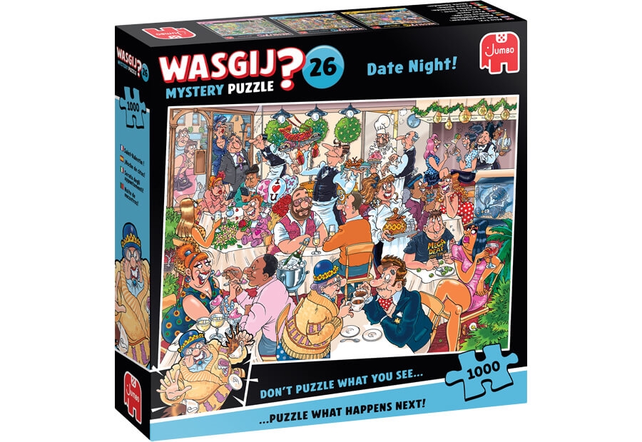Æskens motiv i Wasgij Mystery viser et øjebliksbillede - puslespillet du skal samle viser så et motiv af det kaos som udfolder sig som følge af æskens motiv.