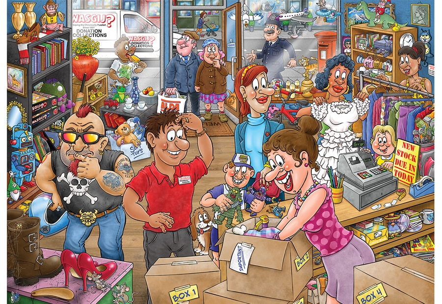 Genbrugsbutikken er et mylder af aktivitet, mens kunderne ivrigt leder efter de gode kup.