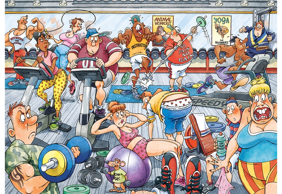 Forestil dig, at du er kvinden på træningsbolden, og saml brikkerne for at se, hvad hun ser – og hvorfor alle i lokalet reagerer så overrasket. Humor, detaljer og overraskelser gør dette puslespil til en ægte Wasgij-klassiker.