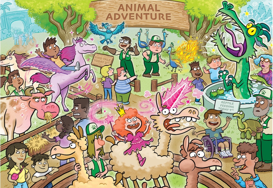 Velkommen til Animal Adventure parken, hvor besøgende glæder sig til at opleve parkens spændende dyr. Der er masser af liv omkring indhegningerne, hvor både børn og voksne kigger nysgerrigt på de forskellige dyr. Men pludselig begynder der at ske noget helt uventet… magiske og fantasifulde væsner dukker op, og stemningen i parken ændrer sig hurtigt!