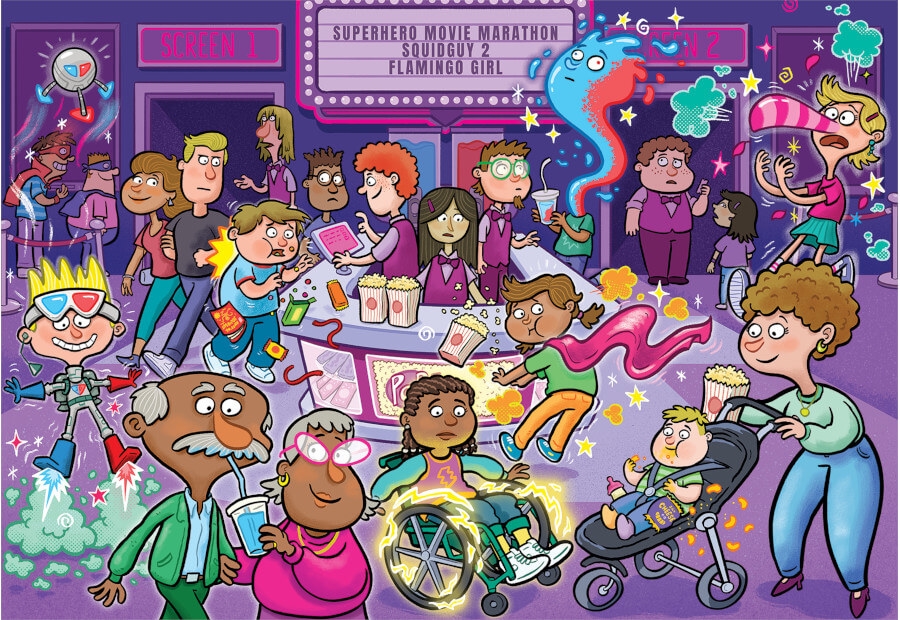 Der er superhelte-filmmaraton i biografen, og publikum hygger sig med popcorn, slik og slush ice. Men pludselig begynder der at ske mærkelige ting omkring snackbaren! Sko ryger, gnister flyver, og nogle gæster begynder ligefrem at svæve – mon filmene er begyndt at påvirke publikum?